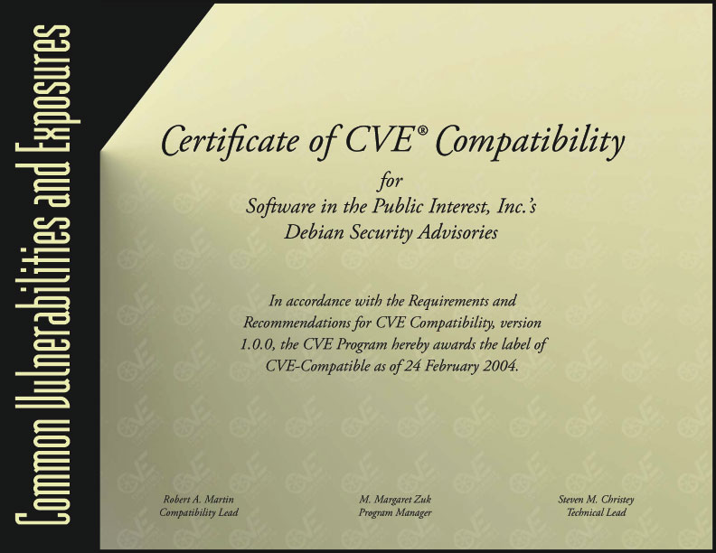 Debian acredita que fornecer aos usuários informações relacionadas a segurança que afetem a distribuição é extremamente importante. A inclusão dos nomes CVE em avisos ajudam os usuários a associar vulnerabilidades genéricas com atualizações específicas, com redução do tempo gasto para manusear as vulnerabilidades. Além disso, é fácil o gerenciamento da segurança em um ambiente onde já existem ferramentas que utilizam o CVE, como redes ou sistemas de deteccão de invasão, ou ferramentas de avalição de vulnerabilidades, mesmo que elas não sejam baseadas em uma distribuição Debian.